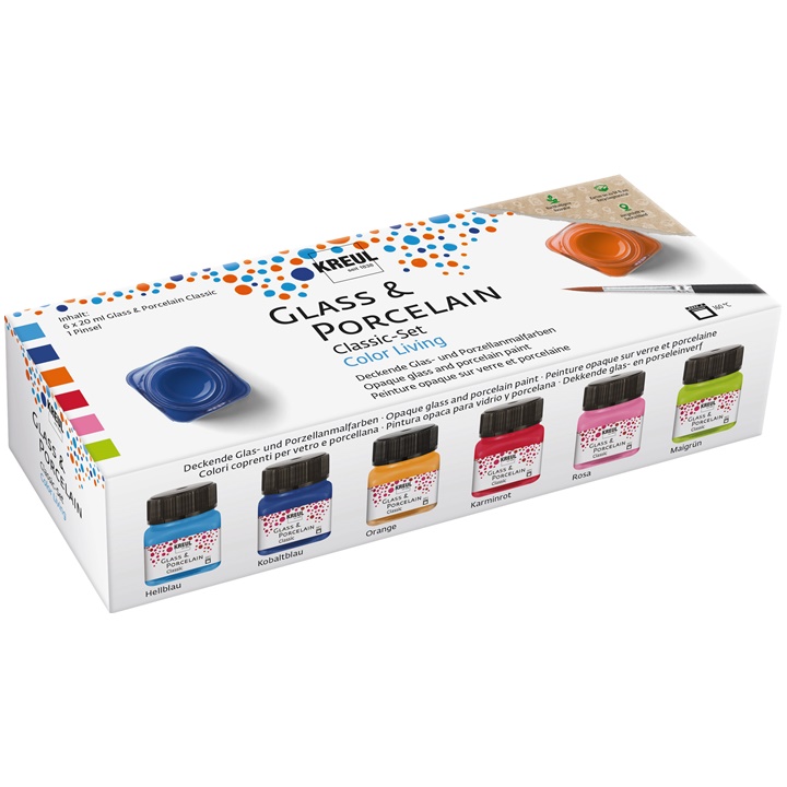 A KREUL Color Living üveg- és porcelánfesték-készlet üveg- és porcelántárgyak festésére szolgáló speciális hobbyfestékekből áll. Élénk színek, fényes hatásúak és krémes állagúak. hőálló anyagok, mint porcelán, üveg, kerámia, terrakotta és fém festéséhez készültek. Fényesek, gyorsan száradóak, fényállóak és vízbázisúak. Vízzel való hígításra nem alkalmasak. A színek egy tisztességes és biztonságos eljárással készülnek Németországban. A készlet csomagolása 94%-ban újrahasznosított anyagból készült kartonból készült.