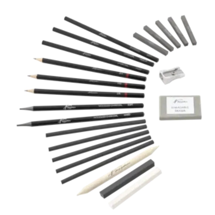 A Nassau Fine Art rajz / vázlatkészlet 24 db nélkülözhetetlen gyűjtemény művészek, illusztrátorok és hobbisták számára, akik szeretnék felfedezni a rajzolás és a vázlatkészítés világát. Ez az átfogó készlet úgy lett kialakítva, hogy mindent tartalmazzon, ami a kezdő és haladó művészek számára egyaránt szükséges, és kiegyensúlyozott választékban tartalmaz grafitceruzákat, szénceruzákat, keverőeszközöket és radírokat - tökéletes a részletes vázlatok, portrék vagy kifejező árnyékolások készítéséhez. A kiváló minőségű grafitceruzák sima, egyenletes vonalakat biztosítanak, míg a szénceruzák és a szénrudak gazdag, mély tónusokat kínálnak a drámai hatásokhoz. A mellékelt gyúrható radír lehetővé teszi a precíz világosítást és összemosást, a papírcsonk pedig segít a lágy átmenetek és textúrák létrehozásában. Az elegáns, rendezett dobozban bemutatott készlet ideális iskolai, műtermi vagy utazási használatra. Akár tájképeket, figurákat rajzol, akár tónustanulmányokkal kísérletezik, a Nassau Fine Art rajzkészlet minden szükséges eszközt biztosít ahhoz, hogy kreatív ötletei életre keljenek.